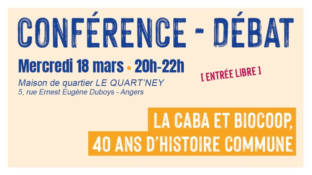 Conférence – Débat | Biocoop La CABA Mercredi 18 mars de 20h00 à 22h00 A l’occasion des 40 ans de Biocoop, cette table ronde propose de mieux comprendre l’articulation entre notre coopérative angevine et le réseau national : fonctionnement, solidarités, indépendance et engagements partagés au service de l’agriculture bio et de l’écologie. Membre fondatrice du […]