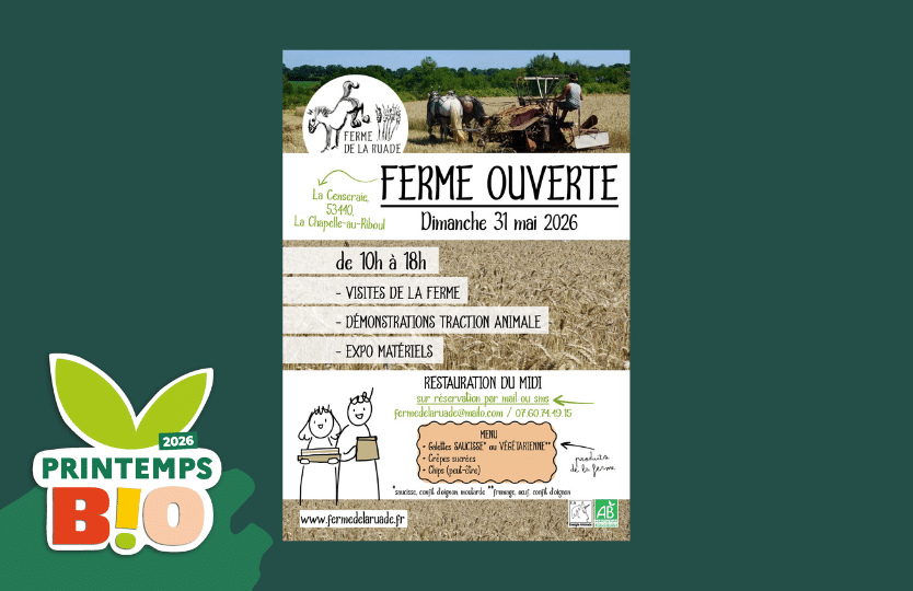 Ferme ouverte – Ferme de la Ruade 31 mai de 10h00 à 18h00 Après 3 ans d’installation à la Chapelle-au-Riboul, nous sommes enfin prêts à vous montrer notre belle ferme. Visites, démonstration de traction animale, expo matériels, vente de nos produits et restauration sur place de nos galettes, crêpes et chips. Gratuit mais réservation pour […]