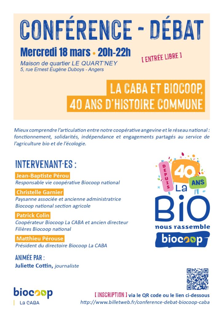 A l’occasion des 40 ans de Biocoop, cette table ronde propose de mieux comprendre l’articulation entre notre coopérative angevine et le réseau national : fonctionnement, solidarités, indépendance et engagements partagés au service de l’agriculture bio et de l’écologie.